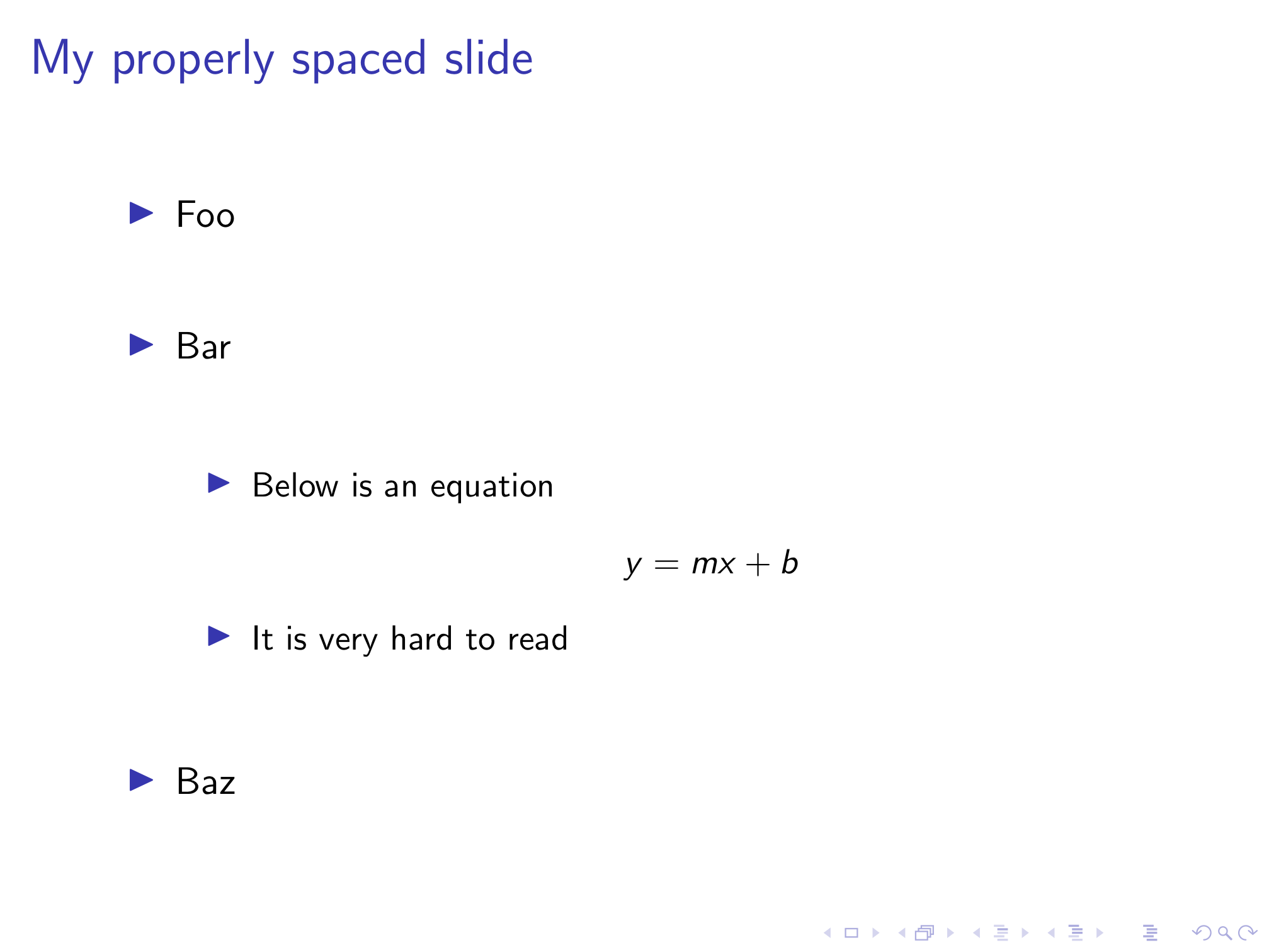 at the top and bottom of the slide, and between each line, but this gets old quickly. After plenty of googling and a few less than perfect solutions, I came across this Stack Exchange answer. By adding the following code to your preamble, any items in a \itemize