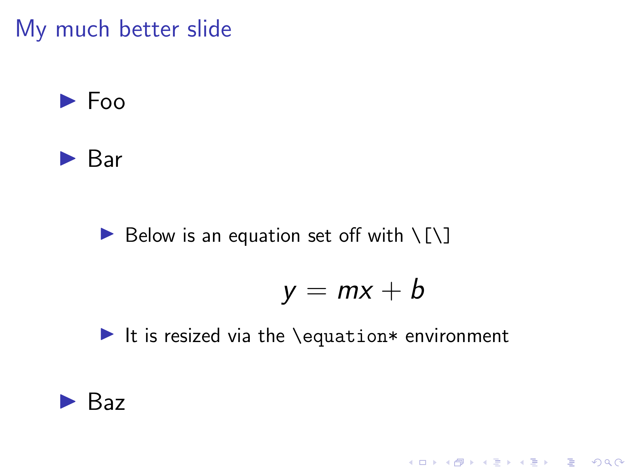 Now we’ve got a much more readable slide that will be automatically replicated for every other slide in our presentation. If you have multi-line equations in your slides, you can similarly redefine the align*