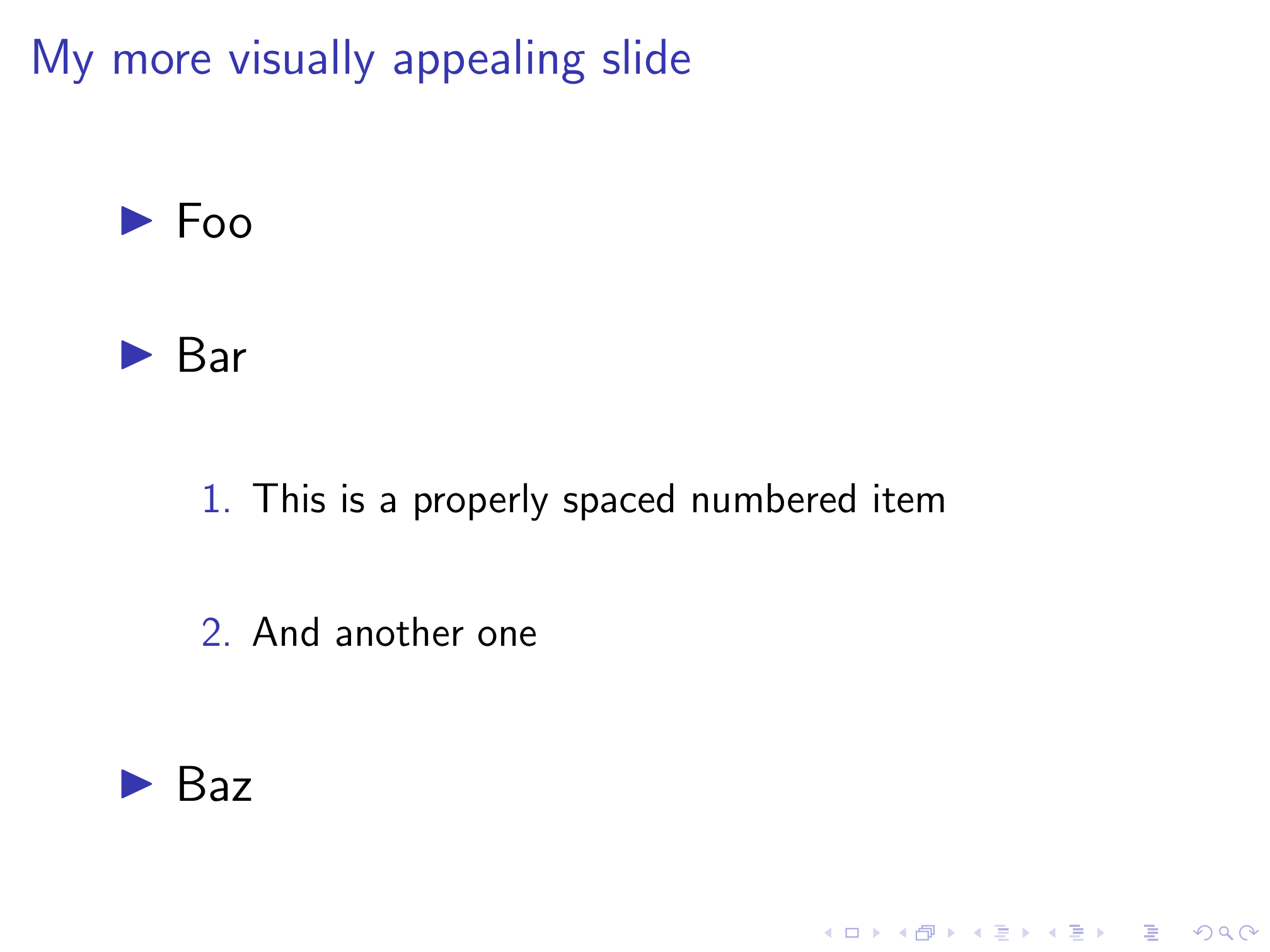 definition in the preamble and redefine it to do nothing, leaving our properly spaced lists intact without having to add an empty line after every item. At some point I’ll post my custom LaTeX template (with other aesthetic improvements) for Beamer slides via R Markdown and talk about my process for modifying the default template.