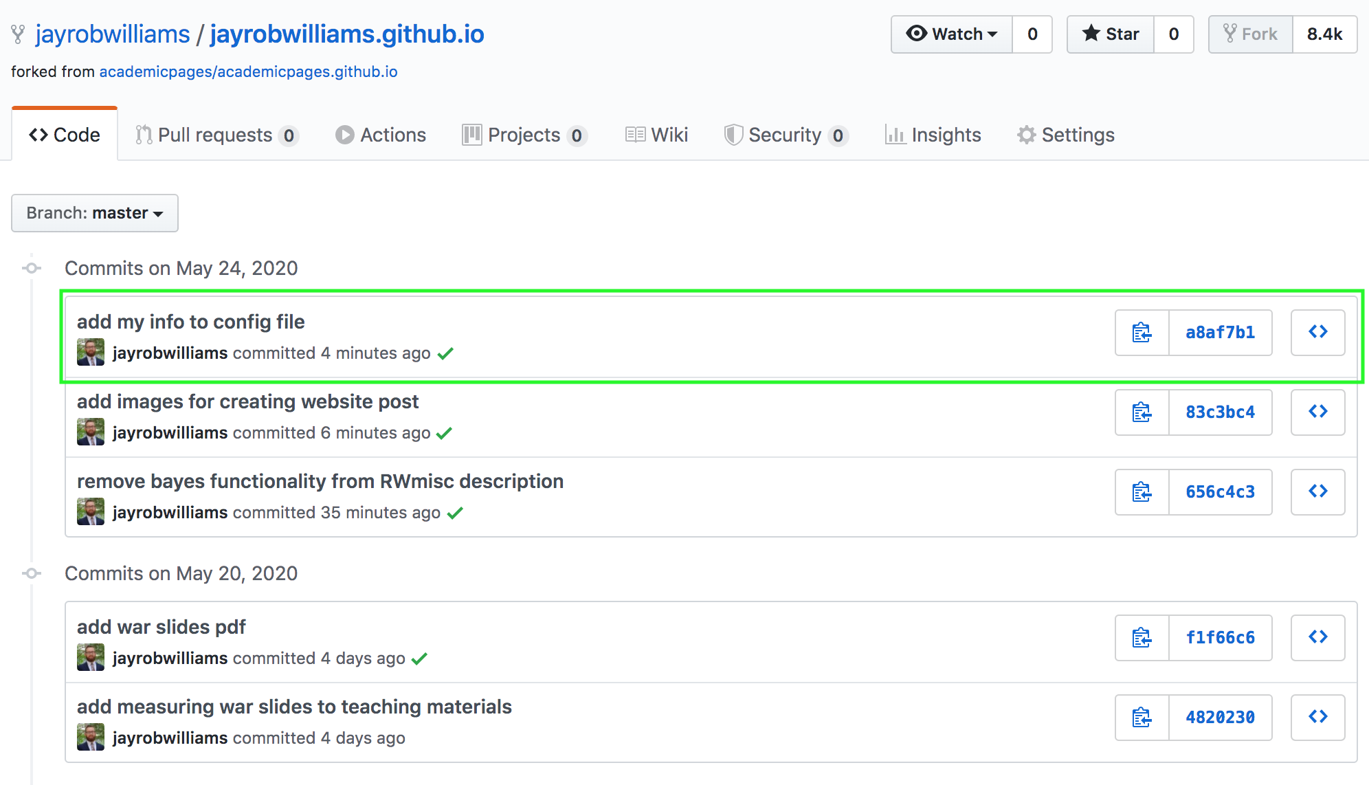 Now, here’s where things may get a little tricky. Go to http://<yourusername>.github.io/ and see if there’s a website there. If there is, skip down to the last section below. If not, go back to the settings page for your repo and see if there’s still a “ready to be published” message. If there is, you may have to push an additional change to the repo to trigger building your site. Editing _pages/about.md