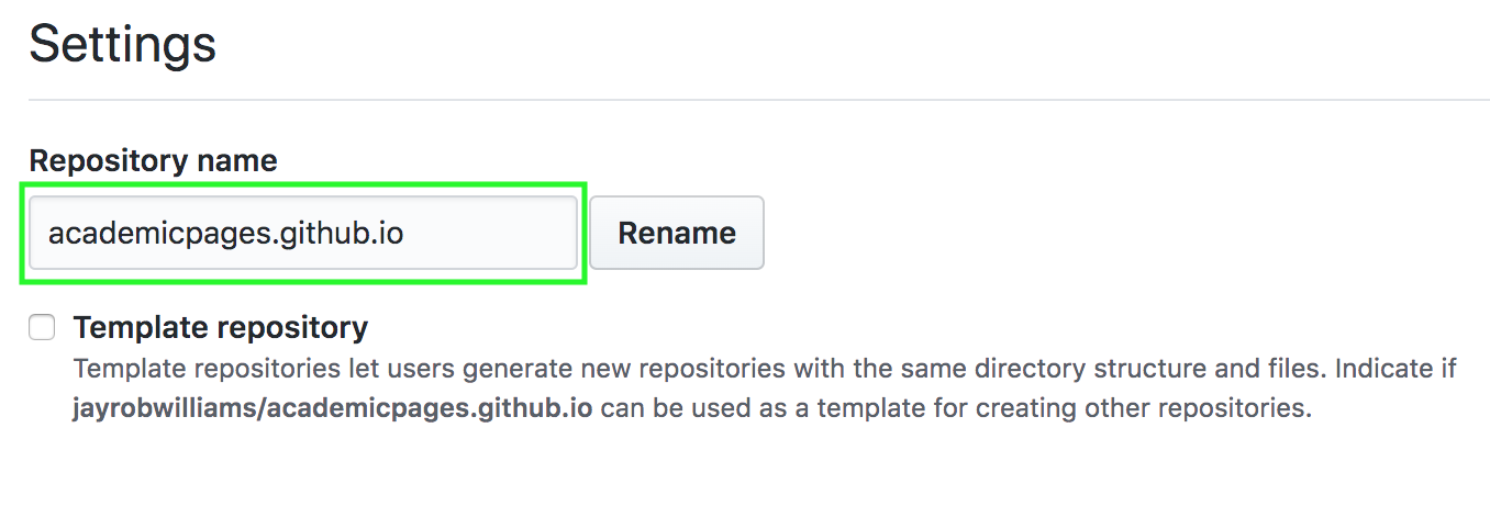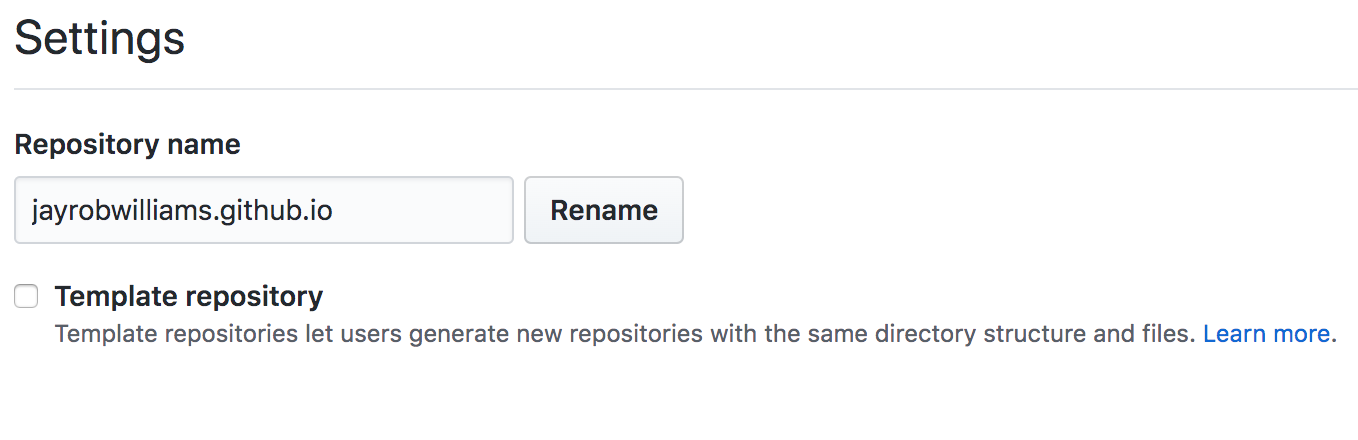 In my case, I renamed the repo to “jayrobwilliams.github.io” because my GitHub username is jayrobwilliams.
