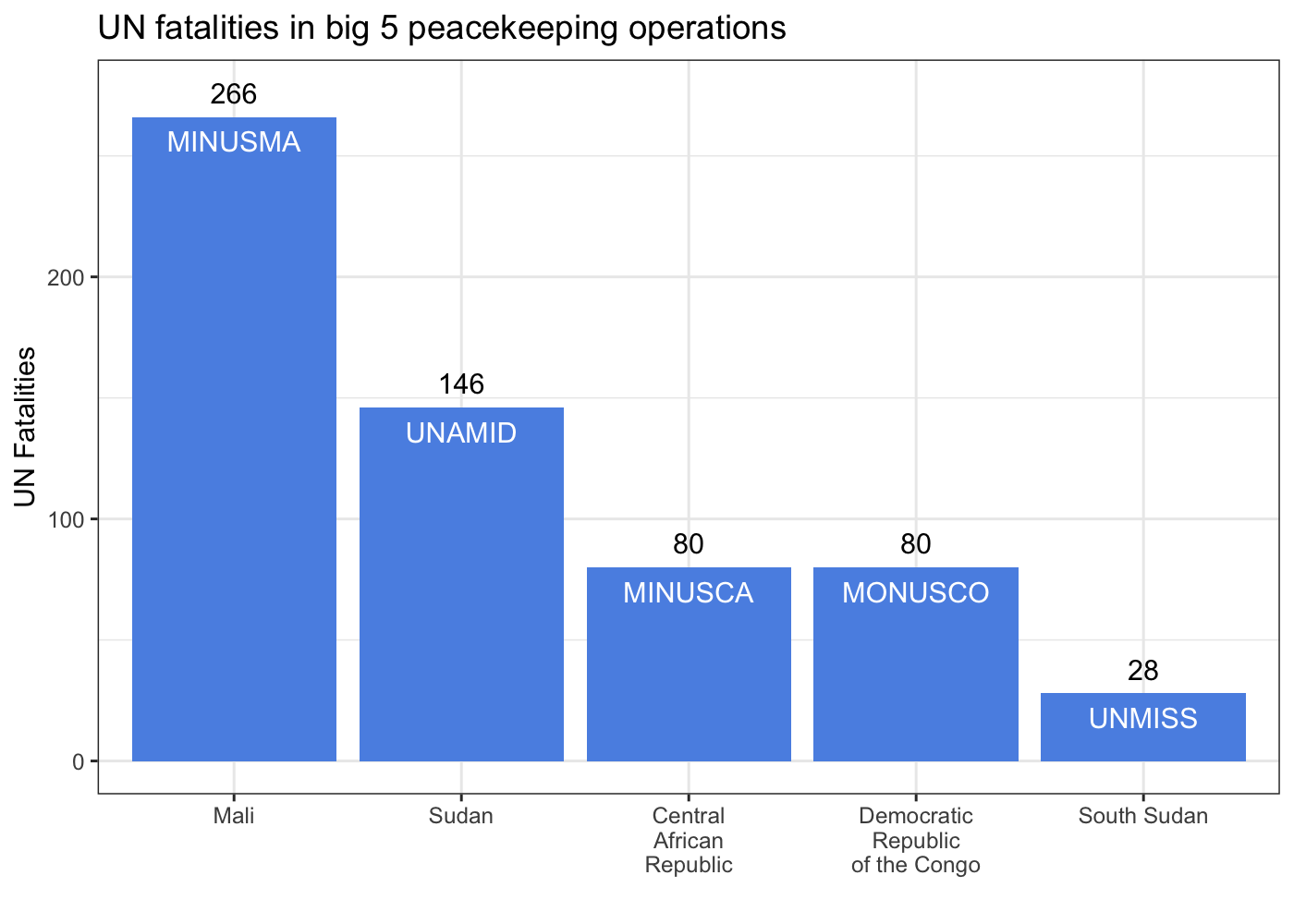 Some coauthors and I recently published a piece in the Monkey Cage on the recent military coup in Mali and the overthrow of president Ibrahim Boubacar Keïta. We examine what the ouster of Keïta means for the future of MINUSMA, the United Nations peacekeeping mission in Mali. One of my contributions that didn’t make the final cut was this plot of casualties to date among UN peacekeepers in the so-called big 5 peacekeeping missions .