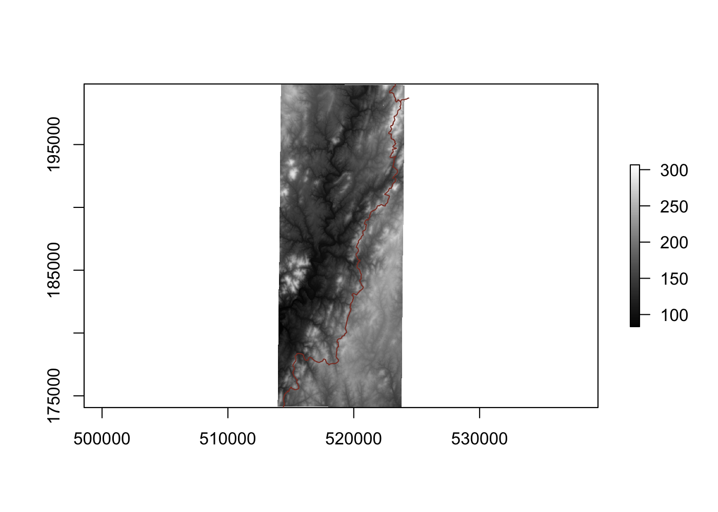 plot(elev, col = grey(1:100/100))