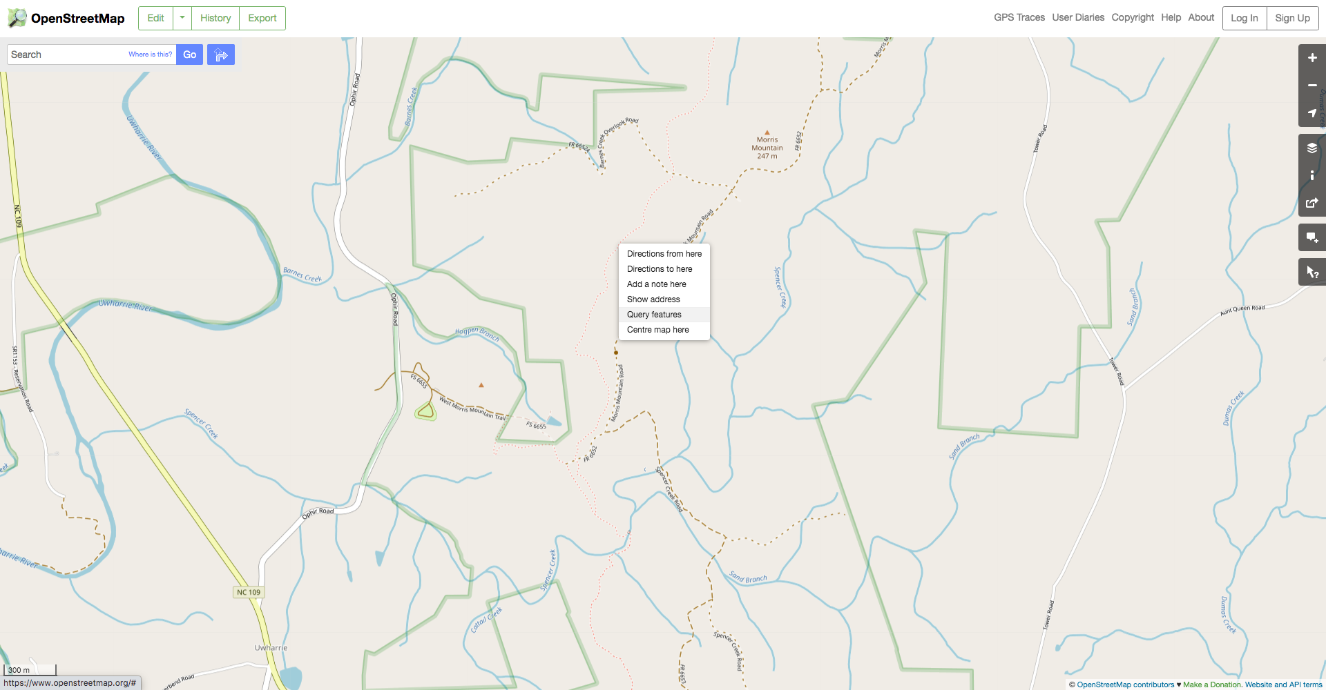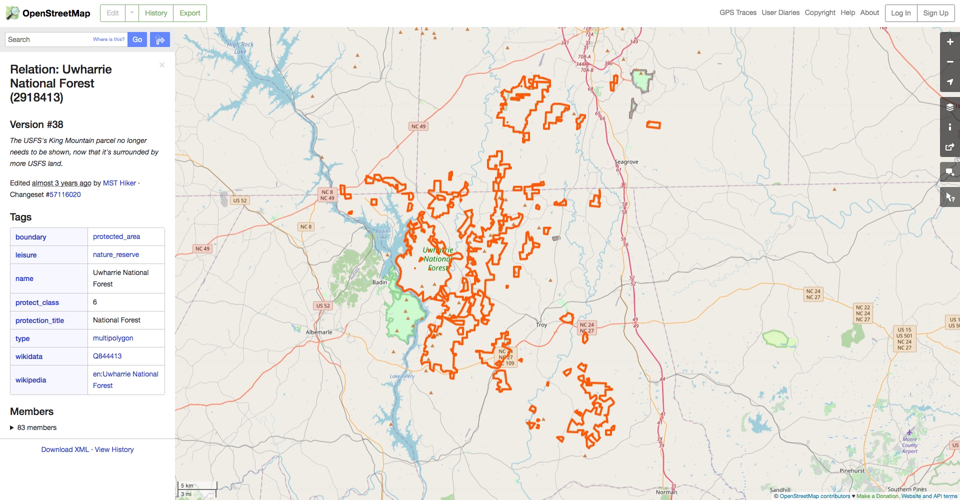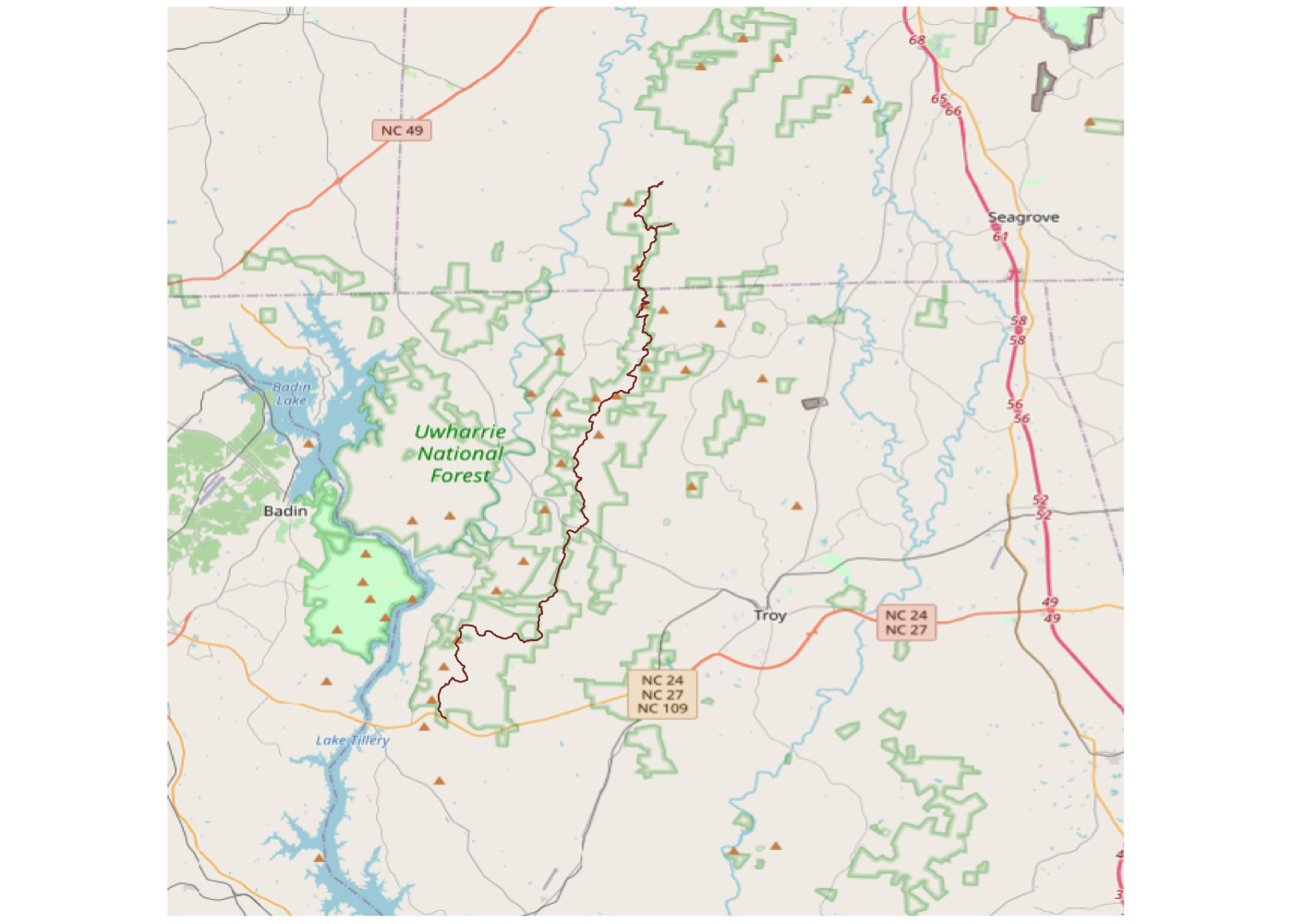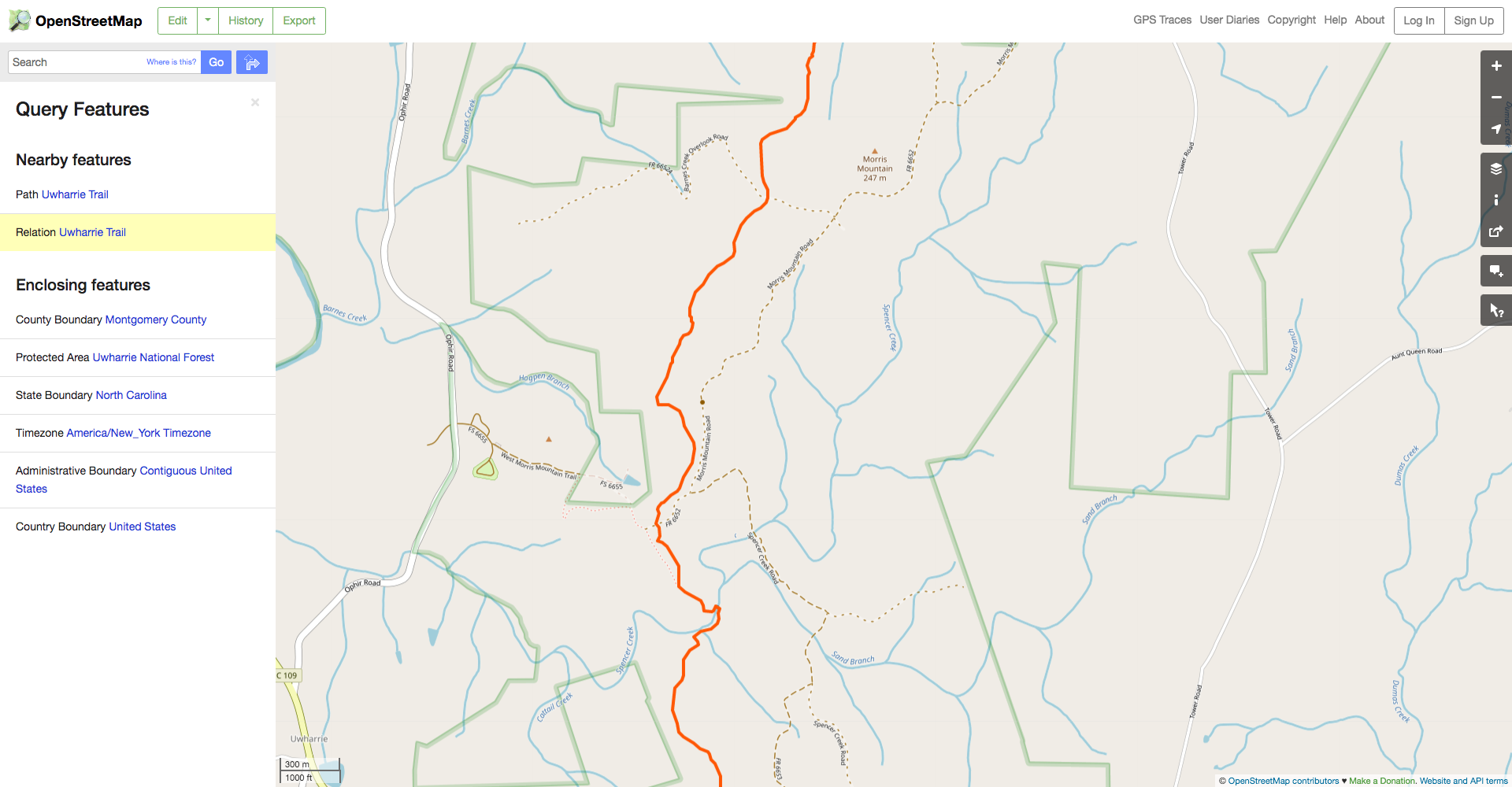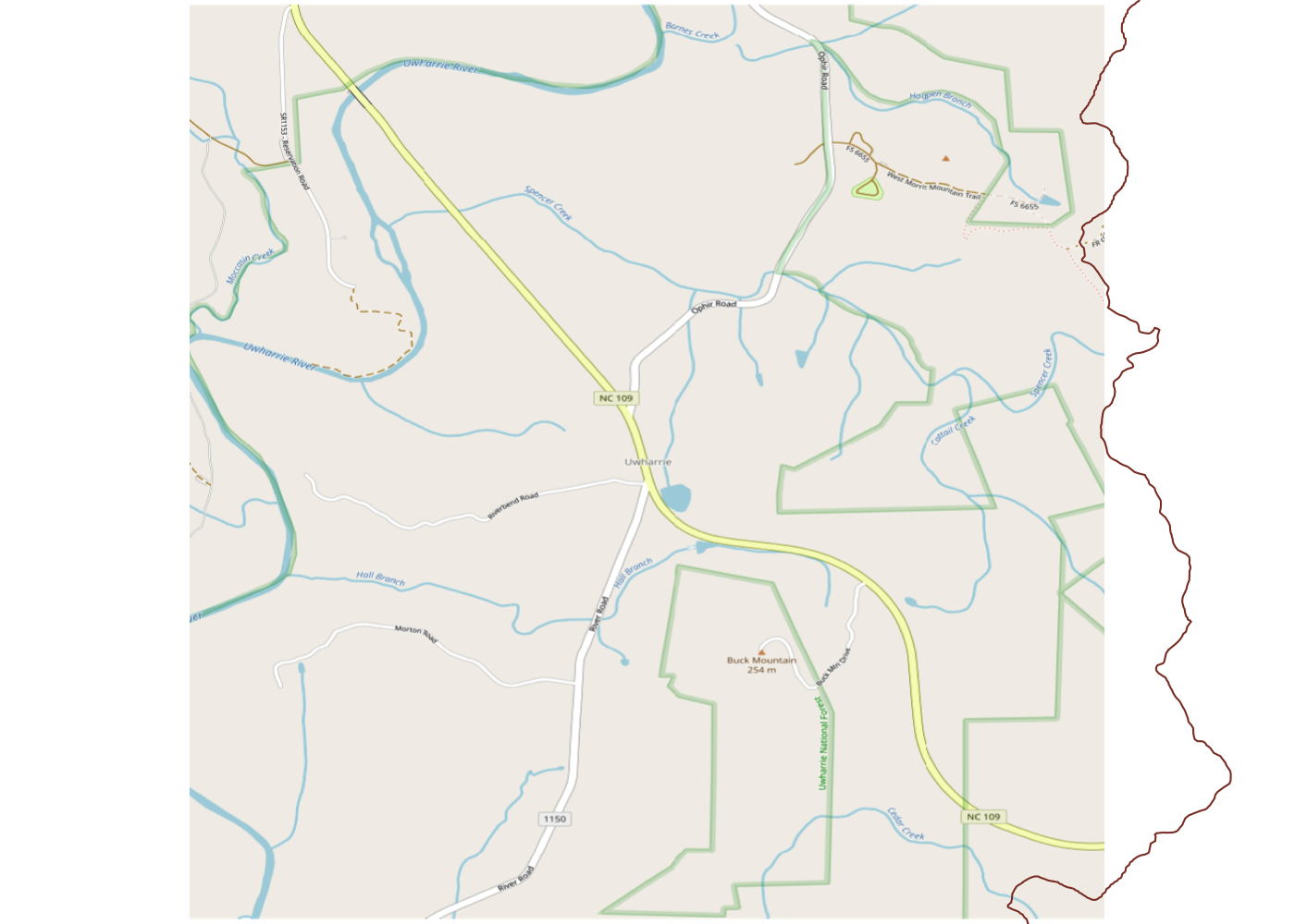 Uh oh. We can see that we’re only getting a small portion of the total trail and that it trails (heh) off the map on three sides. That’s not great, so let’s fix it. We can start by looking up Uwharrie National Forest itself on the OSM website. This gives us the boundaries of the official forest land in orange.
