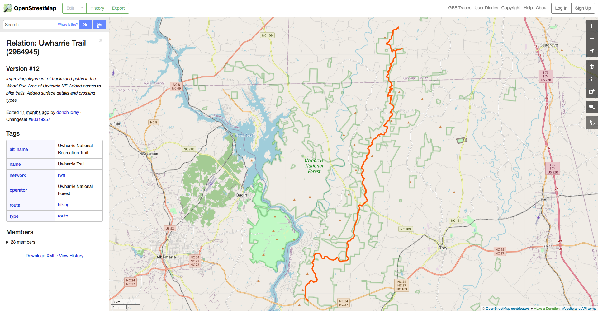 We can see here that the Uwharrie Trail relation has type=hiking